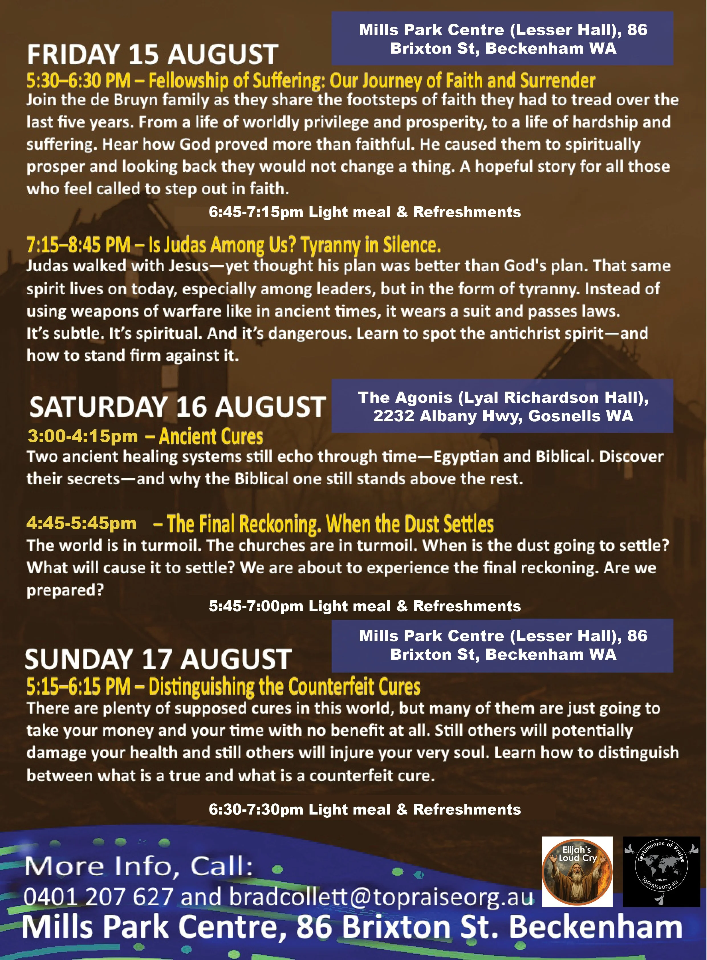 Join Joanna de Bruyn and her family for a weekend of bold, Spirit-led presentations that will challenge, encourage, and prepare you for the days ahead. Known for her unwavering stand for truth, medical missionary work, and deep commitment to God’s Word and the Spirit of Prophecy, Joanna brings a timely voice to the current crisis facing God’s remnant people.